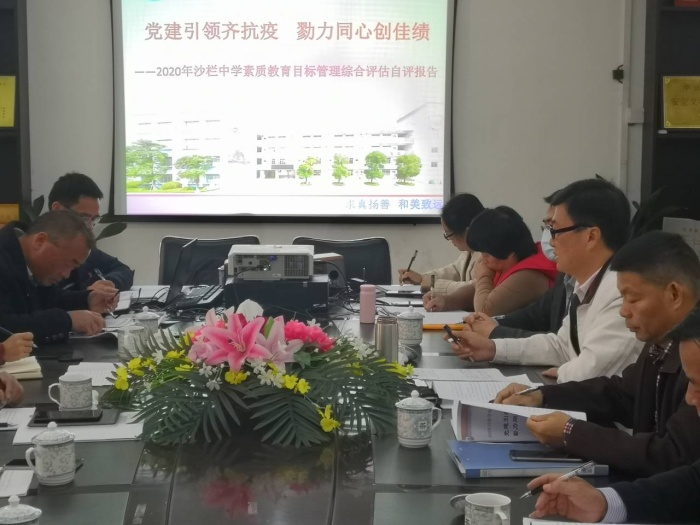 沙栏中学校长梁炳华向检查组做了《党建引领齐抗疫 勠力同心创佳绩》的素质教育目标管理综合评估自评报告。梁校长分别对学校发展规划、课堂教学管理、教师专业发展、德育工作、校园文化建设、课题研究、论文获奖和发表等详细地作了报告,将该校各方面工作全方位地向检查组呈现。