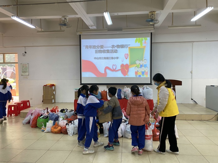 为积极响应中山市少工委倡议,弘扬爱心传播精神,提高垃圾分类、旧物化宝的环保意识、生态意识,引领广大青少年做力所能及的环保行动,1月6日下午,三角小学组织开展“青年拾分爱——衣?物银行”旧物收集活动,为困难人群送上温暖的问候。