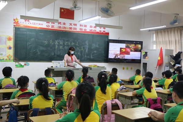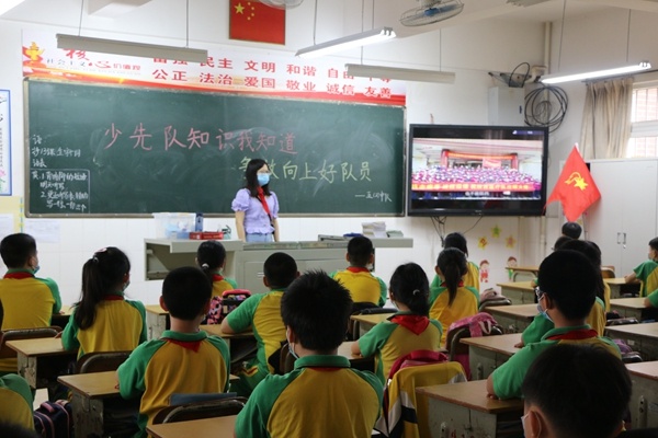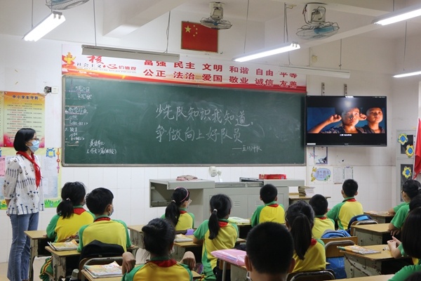 主题队会通过线上、线下两种方式进行。一到三年级的学生,继续由各班中队辅导员通过钉钉直播的方式,学习《光荣的少先队》。学习视频主要从“红领巾小剧场、我的成长史、我的先锋日记、争做新时代好队员、儿童电影赏析和辅导员考考你”这六个方面讲述了队章和少先队基本知识。通过学习,预备队员们对少先队充满了向往,憧憬着能成为一名光荣的少先队员。而四到六年级的学生,在中队辅导员的引领下,在教室里回顾学习《少先队知识知多少》,深入学习少先队的光荣历史,详细回顾了少先队的全称、历史、队徽、队旗、标志、队礼、作风等,辅导员还鼓励少先队员们要“从小学先锋、长大做先锋,努力成长为能够担当民族复兴大任的时代新人”。