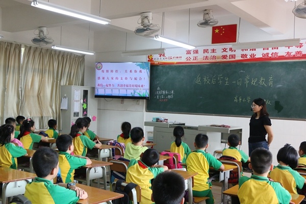 大队辅导员曾丽娟老师对学生们进行疫情防控期间返校后常规教育,曾老师围绕学生上学、上课、课间及课外活动、就餐、午睡、放学及心理调适等七个方面展开,重点强调在校学习时学生各方面的自我防护,力求做到事无巨细,面面俱到。