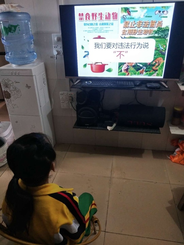 同学们首先观看了一个“保护大自然,珍爱众生命”的主题班会课件视频。通过观看视频,同学们了解到生物多样性是构成和谐大自然的重要组成部分。人与自然和谐相处才能更好地促进社会的发展。但是现今人类无情地剥夺与杀害野生动物,导致了大自然的不平衡与反噬。东非蝗灾与澳洲森林大火都是人类没有做好保护大自然的行动而受到的惩罚。今年席卷全球的新冠病毒的传播则是因为人们捕杀、食用野生动物而造成的。同学们通过对相关事件进行了了解后,加深了“人与自然”、“人类与野生动物”的认识,使他们认识到保护大自然,珍爱生命要从自己做起,要从身边的小事做起,节约用水,绿色出行,拒绝捕杀、食用野生动物,做好垃圾分类等等。同时还树立了要好好对待身边的每一个生命:一只飞鸟、一棵小树、一朵小花,这些都是生命,它们都是大自然不可或缺的一部分。