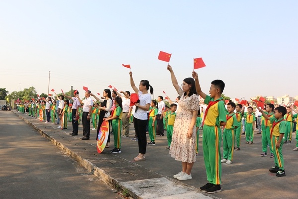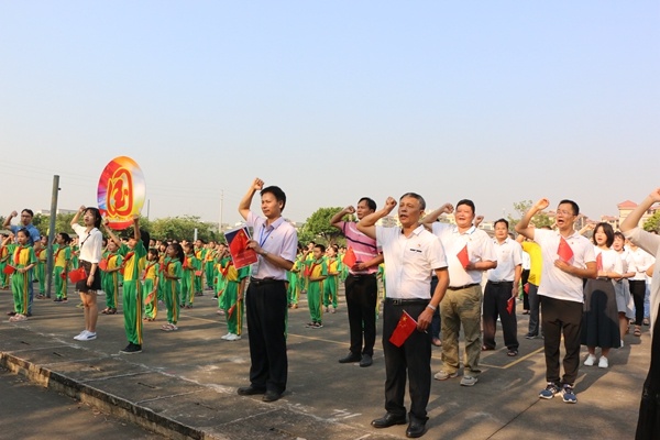随后,全体师生怀着无比激动澎湃的心情,高声齐唱一曲《歌唱祖国》,大家伴着旋律摇动手中的小国旗,深情唱出了对祖国的热爱与眷恋,唱出了广大学子浓浓的中华情。最后,莫校长带领全体师生怀着真挚而又自豪的心情呼号:“祖国万岁!祖国万岁!” 将现场的爱国情感推向高潮。