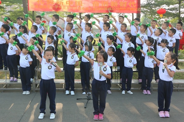 接着,由一(1)班的小同学带来朗诵《大海》,表达了莘莘学子真切的爱国心;五(1)班同学带来合唱歌曲《雨花石》,同学们个个声情并茂,动听悠扬的旋律配上轻快的动作,余音绕梁、歌声回荡,唱出了对祖国母亲最诚挚的祝福。