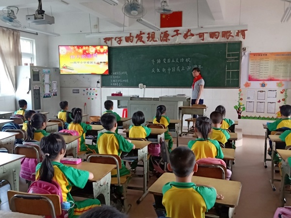 此次队会课由学校德育处李姚清主任统一指导,各班主任精心部署。一、二和三年级开展“齐诵爱国主义诗歌,庆祝新中国成立七十周年”主题队会活动,四、五年级开展“学唱爱国主义歌曲,庆祝新中国成立七十周年”主题队会活动。