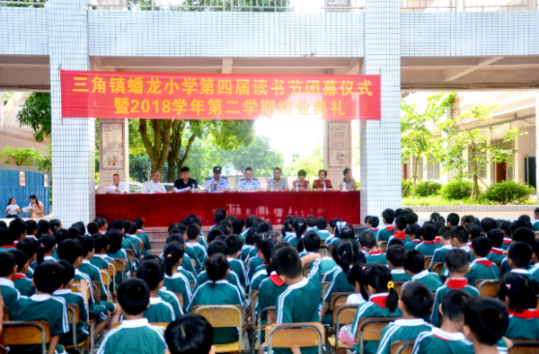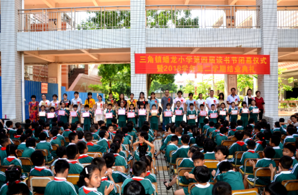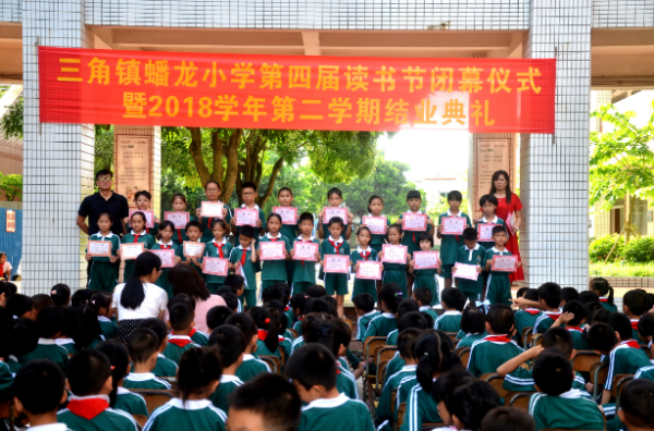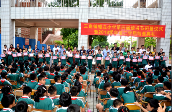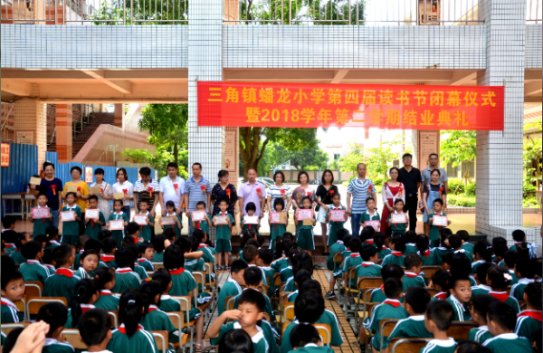 走过播撒汗水和希望的春天,走进校园收获的盛夏,沐浴七月的阳光,莘莘学子即将迎来快乐的暑假。7月5日上午,三角镇蟠龙小学隆重举行第四届读书节闭幕仪式暨2018学年第二学期结业典礼,出席本次活动的嘉宾有蟠龙村副书记黄锦明先生、蟠龙村关工委的老前辈们及一百多名家长代表。