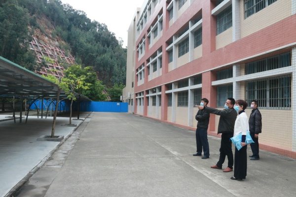 李铭霞一行先后视察了入校检查点、防控隔离室、防疫物资储备室、后山坡整治工程等,详细询问了学校防疫工作的开展情况以及工作中存在的困难与问题。随后,主持学校全面工作的陈见洪副校长对学校的基本情况,教职工、学生健康管理情况,湖北籍学生的具体情况,后山坡整治工程施工情况以及线上教育教学工作开展情况作了详细的汇报。