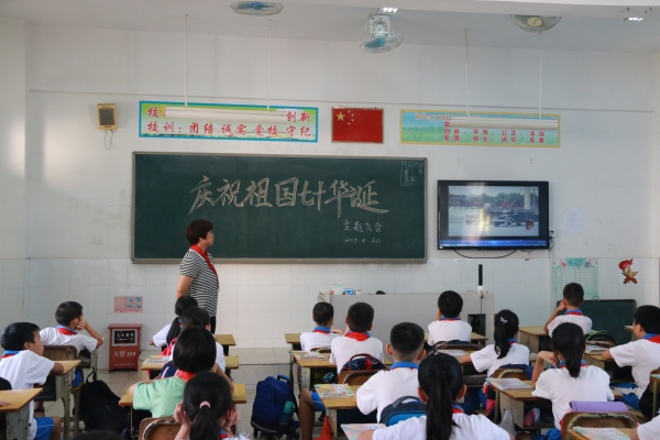 队会上,首先各中队辅导员分别根据中队学生情况,通过故事的形式向学生介绍了国庆节的由来、新中国成立的意义、国旗的深刻内涵。接着,通过图片让队员了解新中国光辉历程、历史英雄事迹、新中国成立七十年来祖国的巨大变化。随后,观看了1949年开国大典的视频和近年来一张张震撼人心的国庆阅兵图片,让队员认识到祖国的强大。最后,队员们通过畅谈祖国的变化、知道如何爱国以及幸福生活来之不易,表达了对祖国的热爱和对美好新生活的向往。