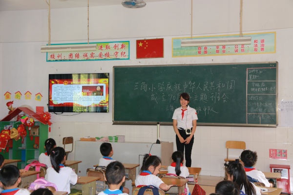 为热烈庆祝中华人民共和国成立70周年,进一步增强队员们的爱国情感、民族精神和民族自豪感。2019年9月30日,三角镇三角小学开展“庆祝中华人民共和国成立70周年”主题队会。