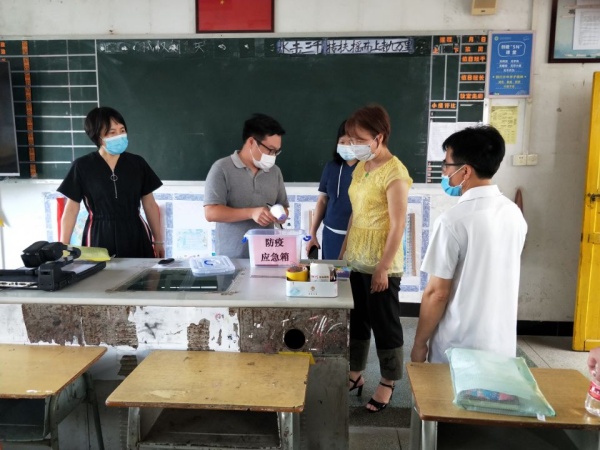 李委员一行到校后,查看了第一批返校的初三学生学习、课间活动、午餐配餐等情况,对第二批返校复学的物资、开学等准备情况一一检查。她来到初一各班教室门口,仔细查看了“防疫应急箱”,对里面的测温枪、一次性医用外科口罩、免洗洗手液等仔细检查,强调测温枪正常使用的重要性,对教室的课桌摆放、卫生清洁、消毒工作做出指导。