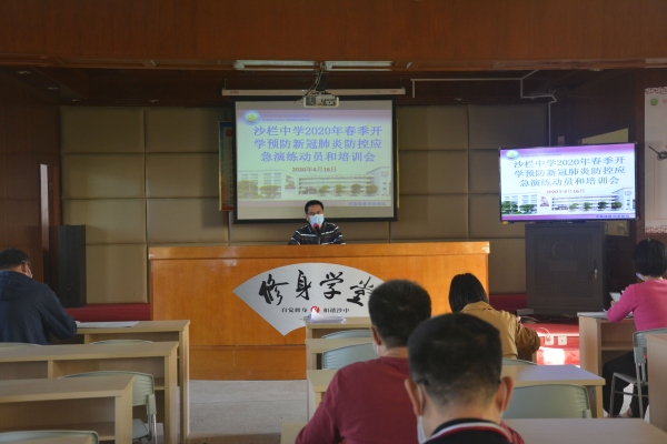 4月16日下午,沙栏中学举行学生返校疫情防控工作培训。全体行政领导、全体班主任、初三级老师、学校卫生工作负责人参加了会议。
