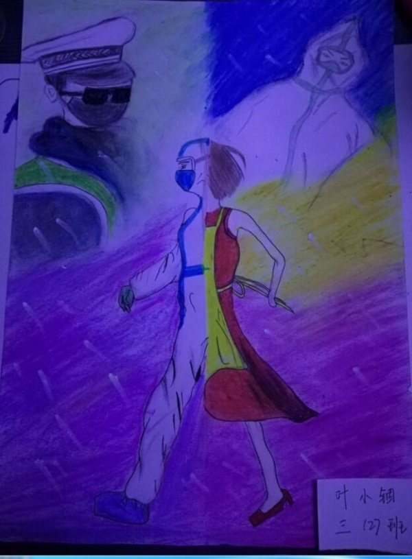 选手们用画笔礼赞战疫感人事迹,用艺术讴歌最美“逆行者”,创作出一幅幅振奋精神、鼓舞士气、传播积极向上正能量的优秀作品。三(3)班的刘祥羽的作品《与死神抢时间》描绘出医护人员紧急救护的场景,二(3)班杨桂珍的作品《加油》用独特的方式提醒大家做好防护。选手们的作品内容充实,感染力强,主要围绕在疫情防控一线的医务人员和其他工作人员加油打气,为“逆向而行”的先锋致敬,向他们送上真挚的祝福:“叔叔阿姨加油!我就在您的身后!”