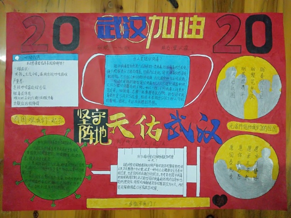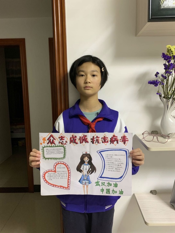 今年的寒假注定与众不同,在新型冠状病毒肺炎疫情的冲击下,有的人变得紧张焦灼而小心翼翼。在这场没有硝烟的战争中,全国上下万众一心,共同抗疫,涌现出一大批“逆行者”,他们身处疫区,不惧个人安危,负重前行,勇挑重担。作为学生,在家做好防疫措施的同时,也应关注国家大事,增强社会责任感和主人翁意识,沙栏中学少工委号召各个中队开展 “学习逆行先锋”云小队活动。各云小队积极行动起来,通过微信,微博、网络、电台、电视等渠道寻找坚守战役岗位的逆行先锋榜样。队员们认真学习了解他们的事迹,把寻找活动的学习成果以手抄报、日记、读后感、文创作品等形式展现出来,3月2日,学校团委收集大家的手抄报作品,通过学校少工委组织,推选优秀作品,为奋战在新型冠状病毒肺炎疫情防控一线叔叔阿姨们加油!
