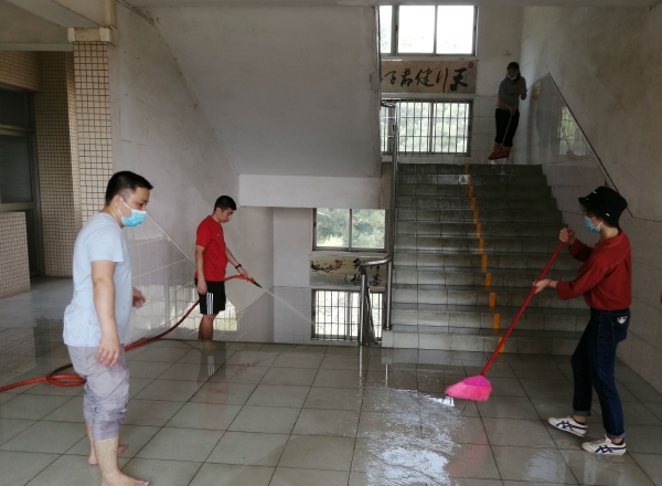 初一年级江玲昕、胡广南、张斯雯、谭礼珍、张婉婷、周沛、梁羡强、陈喜芬、欧杰仪、赵世球、林远芬等30多位老师第一时间到位。初一级长周碧龙负责分发清洁工具,主动带头清洗中楼梯和西楼梯。