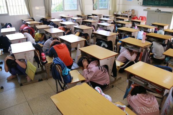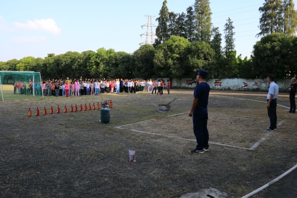 本次演练分三部分,第一部分是防地震和防火灾演练,学生听到第一次警报声后就地在课桌下抱头或头顶书包躲避一分钟,听到第二次警报声后,师生们马上弯下腰、用手捂着口鼻,老师们立即到达指定地点,引导学生快速疏散,各班班主任及任课老师也马上带领学生沿着指定的疏散通道快速而有序地撤离到学校操场安全地带,随即各班老师清点学生人数,并向上汇报。第二部分由三角镇消防大队的姚警官和消防队员们带领我校乘坐校车的学生进行逃生演练。第三部分还是由三角镇消防大队的姚警官和消防队员们为全校师生介绍灭火器的正确使用方法和实地操作。在三角镇消防大队的警官们的指导和全校师生的共同努力下,这次演练活动行之有效,完成得很好。