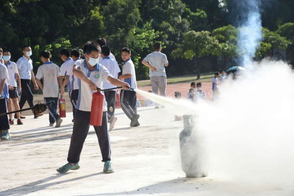 演练结束后,为进一步提升火灾自救实践能力,中山消防救援支队三角大队何队长教员现场对全体师生详细讲解了灭火器材实践操作程序,演示干粉灭火器的操作方法,如何利用灭火器扑灭初起火灾,部分同学还亲身体验了一把操作灭火器灭火的感觉。