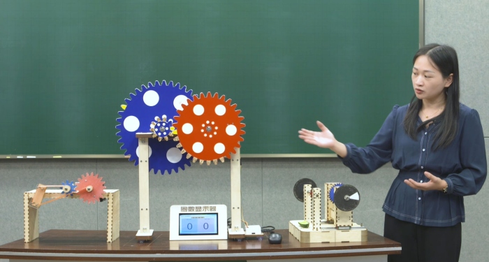 本次自制创新教具是基于粤教版小学六年级《传动的齿轮》这一课制作的,分别有自制砂轮切割机模型、多功能齿轮传动探究装置、以及修正带模型。借助自制的砂轮切割机,直观化了真实的砂轮切割机的工作原理,使学生能够清晰看见齿轮传动在生活中的应用,以此来创设学习情境,很好的激发了学生学习的兴趣;而在多功能齿轮传动探究装置中则创新性的在齿轮的齿上标了数字,便于学生准确地数出两齿轮转动时各自转过的齿数,并且借助了树莓派及霍尔传感器,来准确读取两齿轮各自转过的圈数,利用信息技术很好地解决了学生数圈数容易数错的情况,定性与定量相结合,直观化了学生对齿轮传动具有改变转动方向以及转动速度的特点;而修正带模型通过模拟放大直观化了修正带的工作过程,同时体现了齿轮传动与带传动的应用,为学生后续学习其他传动方式做好铺垫。最终新圩小学科学团队教师的作品凭借制作巧妙的创新教具以及精心设计的探究活动赢得了评委们的高度认可。