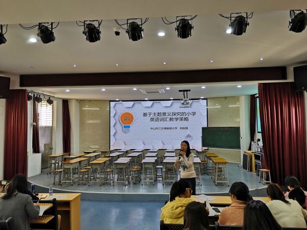 为了让听评课更有针对性,第二环节由三乡镇小学英语学科研究委员会的何旭蓉主任带来一场题为《基于主题意义探究的小学英语词汇教学设计》的讲座。首先,何主任在讲座前对新锐营的学员进行了问卷调查,围绕三个问题与青年教师进行互动:您是如何开展词汇教学的?您是否尝试过依托语篇开展词汇教学?如果有,您是运用什么策略进行的?接着,何主任引用普通高中英语课程标准(2017版)和现场老师们进行探讨主题意义探究的概念内涵。引用程晓堂教授的话:所有语言学习活动都应该是在一定的主题语境下进行的,有效地向老师们传递一个理念:英语教师要具有语篇教学的意识。那怎么依托语篇来开展词汇教学呢?何主任指出可以从三种渠道进行,分别是自创语篇、改编语篇和使用原版语篇。然后深入剖析载德小学英语科组语篇教学的三个案例成果进一步说明语篇补充的原则、目标、策略,让现场老师们对如何通过文本补充践行主题意义探究的词汇教学有了更深刻的理解。