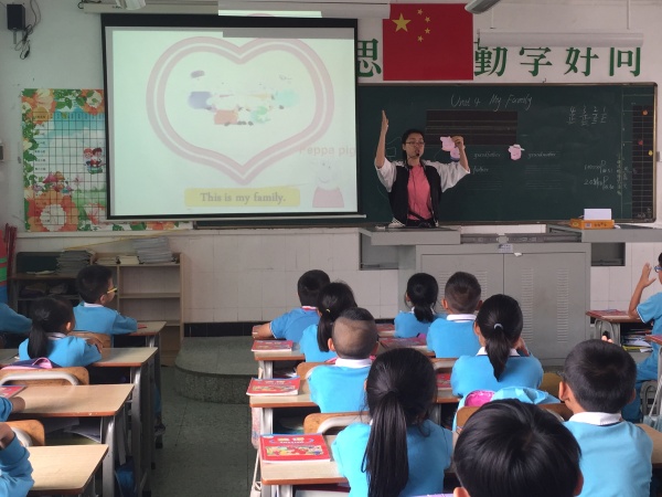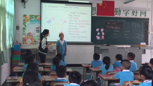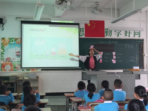 在第二节课,来自载德小学毛志敏老师展示一节三年级上册My Family的词汇课。毛老师本节课注重营造和谐融洽的课堂氛围、教态自然,语调亲切,并能不断鼓励学生,给三年级刚学英语的学生足够勇气去尝试用英语来表达。毛老师通过唱歌方式调动学生学习氛围,设置小猪佩奇介绍家人的情景引入本课的词汇和句型,最后通过游戏和介绍自己家人的任务来巩固所学的目标语言。整个教学环节环环相扣,思路清晰,课堂气氛轻松活泼。