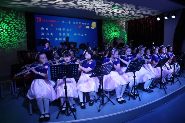 首先由管乐团B团的孩子演奏《狮子王》、《青春修炼手册》、《踏浪》,犹如夏夜里的精灵在月色下歌唱、舞蹈,那忽高忽低、忽断忽续,此唱彼和、一扬一顿,是一支清幽的乐队,在奏着清幽的曲子。