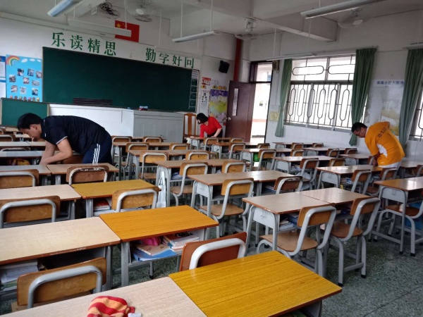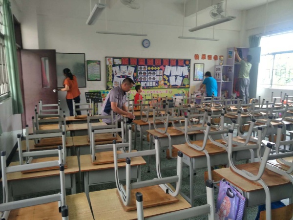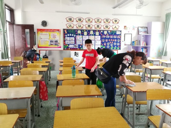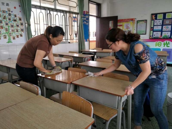 学校利用周末时间,对学校的场地进行了喷药消毒,各班家长积极响应学校工作,牺牲自己休息时间回校用清水擦拭教室桌椅,抹掉了残留在桌椅表面的药物,给学生一个干净舒适的学习环境。