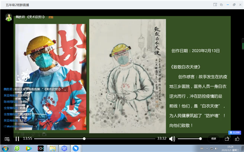 魏胜君老师在2月初就对“白石墨韵”兴趣班的同学进行了网上教学,魏老师就他自己创作的“抗击疫情”水墨作品与同学们分享,学生从艺术的角度去感受当前的疫情给大家带来的严重性,同时再现为之奉献的感人故事,让同学们好好学习,学会感恩。周学明老师从美术欣赏入手,借助《如果国宝会说话》视频让中年级的学生在家里进行美术的学习,发现艺术之美,从而去创造美。黄银萍老师结合低年级的年龄特点,设置了一些线描画、涂色游戏等,加入一些艺术作品的欣赏,达到育人的目的。
