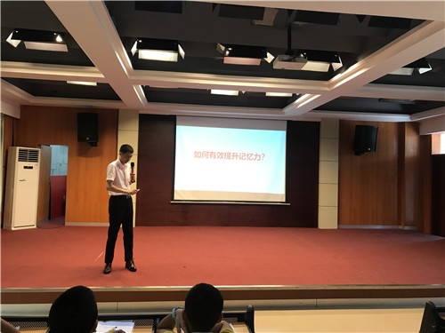 接着,由记忆学习法高级讲师吴杰斌老师做“如何有效提升记忆力”的讲座。吴老师利用身体部位教会同学们科学记忆十二星座,几分钟的时间同学竟然能够快速并准确地记住了十二星座。还利用图片关联法教会同学们记忆鲁迅的七部作品。吴老师让同学发挥自己的想象力,学着自己想象单词之间的关联,以此来记忆单词,掌握了方法的同学们很快完成了挑战,体会到学习的乐趣。