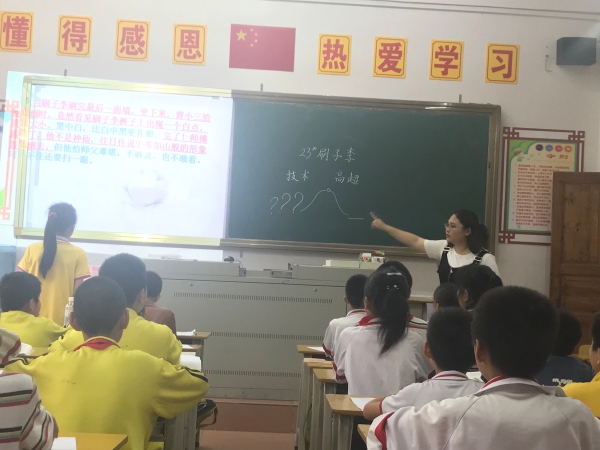 萧泳仙老师上的是五年级语文《刷子李》,课上,萧老师用自己激情幽默的教学语言让学生体会到了刷子李的技艺高超,学会了写作要学会选用典型事例,设置“意外”让情节一波三折。巧妙的教学设计和自信大方的教态成功地感染了五(6)班的孩子们,孩子们在萧老师的引导下从一开始的不敢说到会说,参与交流的老师们也表示受益匪浅,纷纷为这样巧妙的教学设计和教师的教育热情点赞。