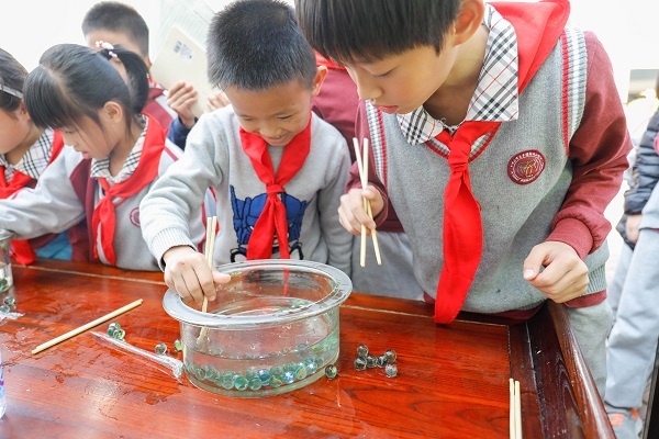 这次游园活动的方案教导处20天前就已公布,各位老师按方案有条不紊地进行准备。共有5个园区,游园项目的设置在去年基础上有所增加,具有鲜明的年段特点。猜字谜、对春联、填诗词、背经典、数青蛙、搭七巧板、趣味成语、生活与数学、英语完形填空……30多个游艺宫精彩纷呈。上午所有题目已挂好,并有一簇簇气球装饰。两点整,各班学生拿着活动记录单和笔进入游艺区,一、二年级园区在香樟园,有10个班的同学参与;三、四年级园区在羽毛球场,高年级园区在阶梯室侧面的凤凰广场。新增的“踢毽子”项目吸引了很多男孩子,赵老师一边指导动作,一边鼓励他们多玩几轮。不一会儿,负责对答案的“宫主”前排起了长龙。有的同学很有策略,专门在自己擅长的某个项目排队答题。有的在“趣味扑克”那儿冥思苦想;有的摇头晃脑数青蛙;有的胸有成竹地背出古诗文或对出下联;有的同学猜出很难的成语,得到“宫主”夸奖眉飞色舞;有些两两合作,一下子答出题目要求的六个成语满意离开;有的因为所选题号已被人答过稍显遗憾随即又投入“战斗”……