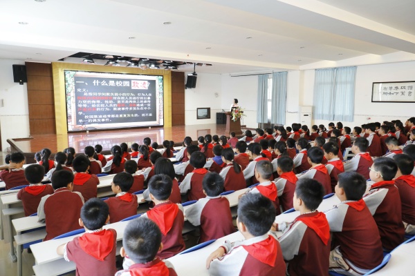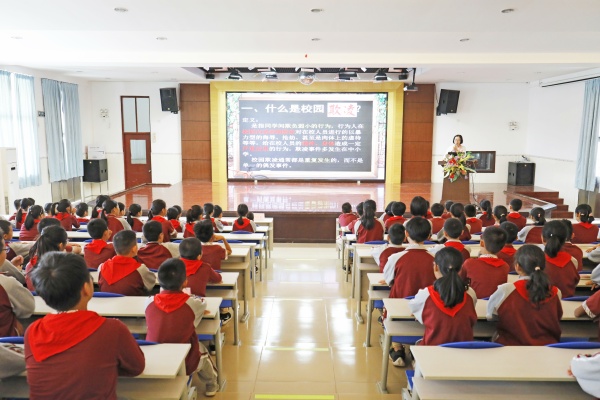 2019年11月1日上午第四节课,新圩小学五六年级学生在阶梯室接受了防校园欺凌主题教育,聆听相关主题讲座。由肖志红校长主持并主讲。