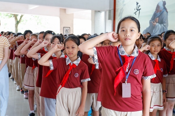 典礼第三项由少先队大队委黄子烽同学进行以“大爱中国,从勤学做起”为主题的国旗下讲话说,他悉数古今中外的勤学爱国名人,以及新圩勤奋好学的学子为榜样,要用科学文化知识武装自己,成为一个可信任、可依靠、有能力的祖国接班人!随后,带领全体新圩学子进行庄严宣誓,表达了积极学习水滴精神,做坚韧通达少年的志向。