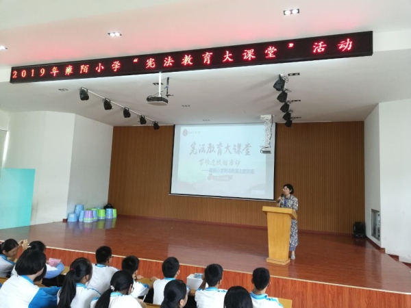 为增强学生的法律意识,提高自我保护能力,营造文明、平安、和谐的社会育人环境,5月30日下午,雍陌小学开展“宪法教育大课堂”活动,由德育主任谭建玲为六年级全体同学举行了别开生面的法制教育讲座。