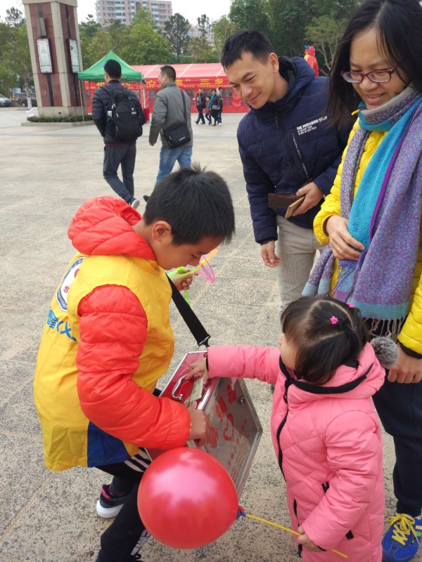 早上9:00,亲子义工们来到了集中的地方,满怀信心今天自己的行动一定能筹集更多的善款。大家穿好义工服,拎好筹款箱,来,摆出灿烂的笑容,来一个大合照!带队的负责人李冬梅、刘红迅速组织各位,分配好任务,有留下打汽球的,有外出筹款的。各家庭自由组合,三五成群,带着爱心,付出行动,出发!
