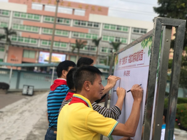 在铿将有力郑重的承诺后,由陈苕校长带领学校的行政团队进行签名,各班派五名代表上台开展承诺签名活动。在活动结束后,让高年级的学生在班主任的带领下全员参与签名承诺。
