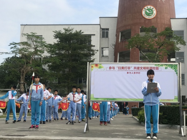 首先,由德育主任谭建玲向全校师生再回顾了解什么是“扫黄打非”,让大家认识到“扫黄打非”活动中大家能做什么。做好五项基本任务:一是坚决打击违禁内容出版物和各类非法出版活动。二是坚决清除淫秽色情等文化垃圾和网上不良信息。三是坚决打击各类侵权盗版活动。四是坚决查处和取缔非法报刊。五是坚决查处利用互联网传播不良信息和侵权盗版行为。