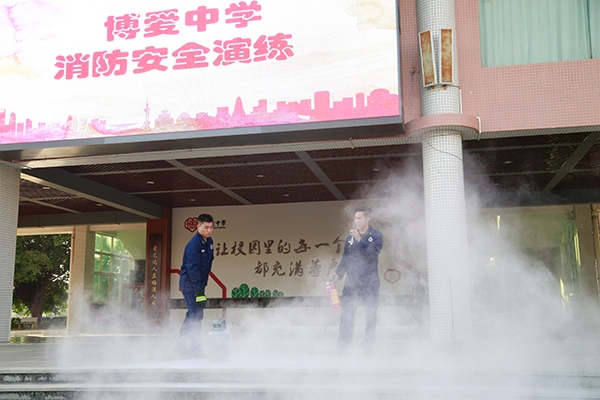 下午15:30,消防官兵在博爱中学校园拉响了演练预警声,全校师生在烟雾中安全、有序、迅速地从教室撤离到运动场。演练过程中,全体师生积极配合,合理应对,服从指挥,有条不紊地进行疏散,在最短的时间内,安全有序、镇定快速地到达操场集合地点。体现了师生在危险情况下相互关怀、相互合作精神,增强了博爱人的凝聚力和向心力。紧接着,消防官兵为学校师生展示了逼真的灭火救援演练。