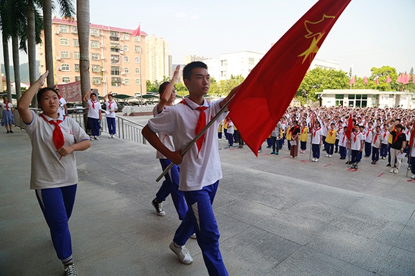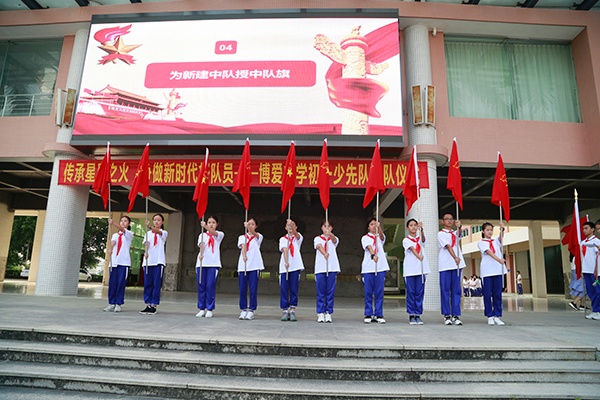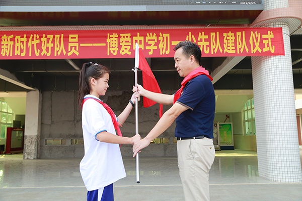 2019年9月26日,为引导队员们继承和弘扬少先队的光荣传统,增强少先队员的光荣感和自豪感,培养少先队员的民族自豪感和爱国、爱队之情,展现新一代少先队员的风貌,激励、教育全体少先队员听党的话,爱祖国,爱人民,爱学习,做共产主义事业的接班人。博爱中学组织举行了以“传承星星之火 争做新时代好队员”为主题的初一少先队建队仪式。