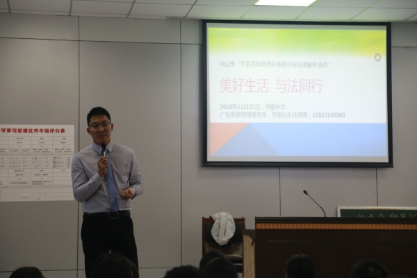 11月27日下午,中山市“千名青年律师千场青少年法律服务活动”在三乡镇博爱中学举行。广东宪鼎律师事务所罗景山律师给初一级的学生带来了一堂生动的预防未成年人犯罪的法制教育课。