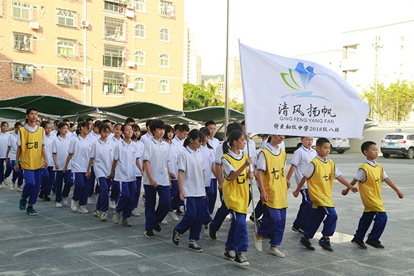 初一级各班在班主任组织下以班级为单位静候进场比赛的指令。随着跑操音乐响起,各班按照抽签顺序踏着节奏,整齐列队跑步入场。在跑操过程中,同学们通过响亮有力的口号调整步伐,整齐划一。口号声、脚步声,响彻整个运动场。各班学生精神饱满,斗志昂扬,用整齐的排面,嘹亮的班级口号,极具特色的班旗,恢弘的气势,展现出班级风采,跑出了班级荣誉和团结。