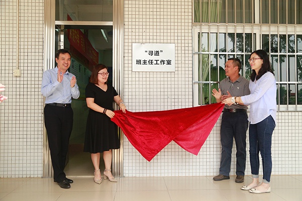 最后,由文体教育局梁添带书记、林雪萍老师、张政校长和陈攸秀老师为班主任工作室揭牌,标志着博爱中学“寻道”班主任工作室正式成立。