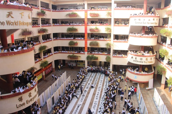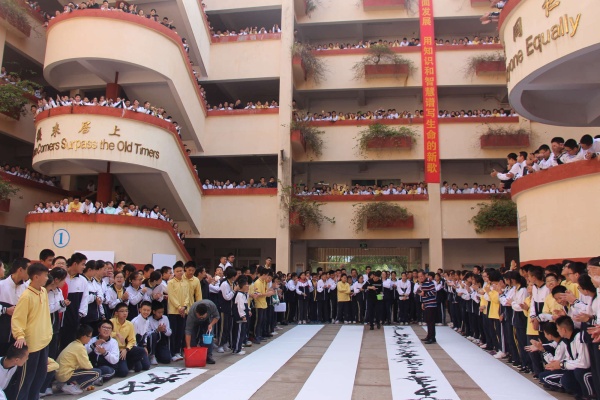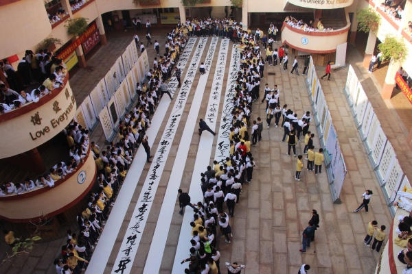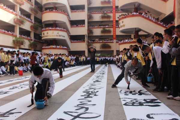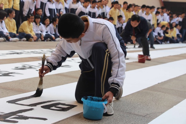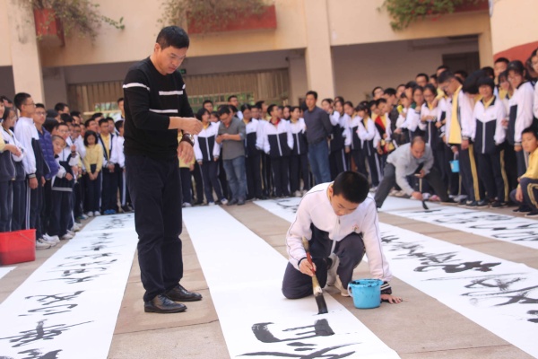 他今年12岁,学书6年,此次展出毛笔、硬笔作品近百幅,兼具篆书、隶书、楷书、草书、行书众体等。展出现场,中国书法家协会会员、三鑫书法中心主任单永辉与三鑫蒋疑明、朱晓杰等书法教师鼎力相助,与郑成卓一起,师生现场挥毫泼墨。初中部教学楼五个楼层,三千多师生围观,场面震撼,掌声、呼喊声不断!