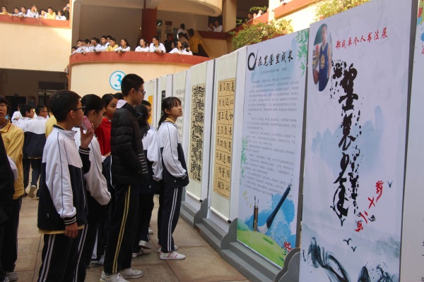 12月26日,举国上下以各种形式纪念毛主席125周年诞辰,纪中三鑫双语学校初一、初二教学楼书墨飘香,热闹非凡。同时,学校、班级的微信群、QQ群,老师、家长们的朋友圈都在刷屏,大家都在谈论着一位“墨里少年”——郑成卓。这一天,对他来说,也是非常重要和有意义的一天。因为今天,“墨里少年12岁”——三鑫初一年级郑成卓个人书法展在大家的期待中在初中部揭开他神秘的“面纱”。