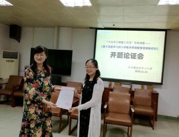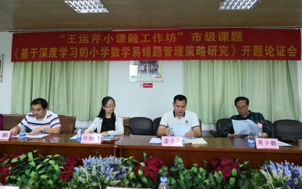 2018年11月13日下午,三乡镇光后中心小学“王运芹小课题工作坊”市级课题《基于深度学习的小学生易错题管理策略研究》开题报告会在光后中心小学会议室举行,全程由曾彩虹老师主持。中山市教研室教研员林晓洁老师、三乡镇教育事务指导中心潘光利主任、原三乡镇教育党总支周少鹤书记与大布小学曾鹏主任四位课题评议专家莅临指导,光后中心小学龙朝晖校长,熊昌河、张婕妤、李俊玲三位教导处主任以及全体数学老师参与了此次会议。
