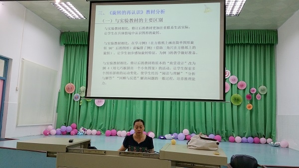 曾彩虹老师、李朝晖老师和王运芹老师分别就小学阶段“轴对称”“平移”“旋转”的相关教材进行了对比和解读。三位老师分别从“课标中该知识点在各学段的教学要求”、“人教版教材中关于‘图形的运动’的教学目标和内容编排”、“人教版教材该知识点新旧教材内容编排的变化纵向比较”、“不同版本教材该知识点情境创设、教学内容、学习材料等编排的横向比较”、“基于教材解读的教学建议”等方面展开,使全体参会老师对于本次活动的主题内容有了更深、更广的了解。