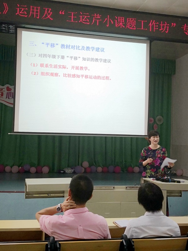 王运芹老师还围绕四大领域中的“图形与几何”领域,研读了小、初、高数学教材,从知识点分布、内容衔接、价值取向、目标界定等方面解读了基于课程标准的义务教育数学教材和高中数学教材,并提出了基于教材内容衔接的小学数学教学启示和教学建议,让与会老师拓宽了视野,提高了认识。