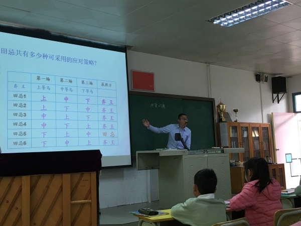 本次活动先由夏传霞老师执教《田忌赛马》第一课时,借助故事情境完美地解决了4个问题:①理解最佳策略是什么②最佳策略是怎么找出来的,感悟优化思想③学习对策问题的意义——绝不仅仅是掌握“对方先出、以弱胜强”这个最佳策略,更应培养寻找最佳策略的优化意识。④避免2个思维定势:对策问题不只是田忌赛马的以弱胜强,最佳策略也不一定就是唯一的——拍球比赛从三局两胜到四局三胜,成功打破学生的思维定势。
