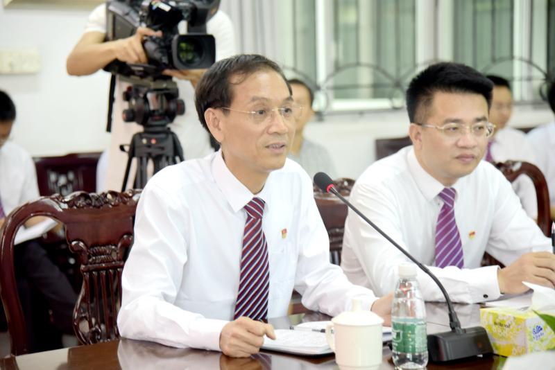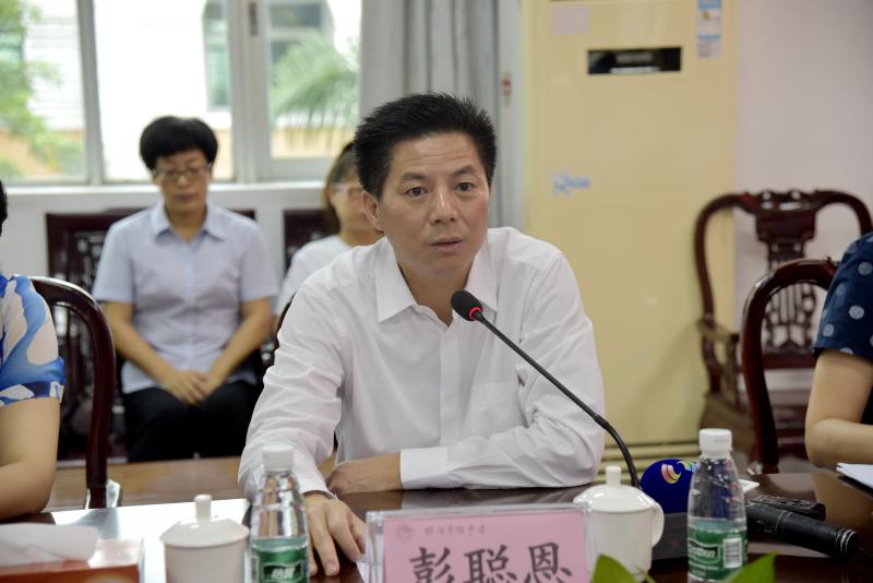 在学校会议室,彭聪恩区长一行与华侨中学高三年级教师代表进行了亲切的座谈和交流。彭区长与参会教师代表一一握手,并热情祝贺他们在2019年高考中取得优异成绩。