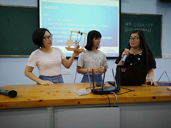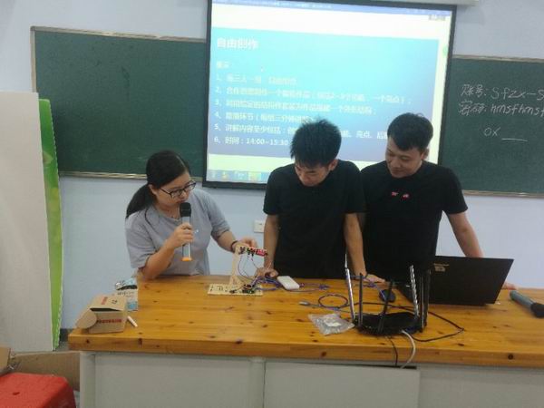 经过一天的基础知识学习,第二天下午,分小组进行项目制作和路演汇报。各个小组的老师都使出浑身解数,把两天培训中所学到的技术以及团队的创意发挥得淋漓尽致,在硬件有限的条件下实现各种有创意的创客作品,路演汇报环节精彩纷呈,充分展示了我区在创客教育的师资潜力。