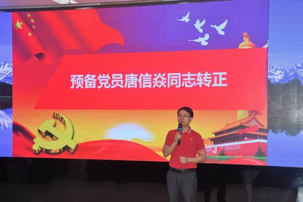 党员大会分三项议程。第一项议程是预备党员唐信焱同志的转正讨论及表决。唐信焱同志作了近一年来的思想、学习、生活、工作汇报,隆重地向党总支提出转正申请。其入党介绍人及其他党员同志分别对其表现作了表态发言。全体党员举手表决,全票通过,同意唐信焱同志按时转正,正式成为中国共产党党员。唐信焱同志表示以后要一如既往,不忘初心,牢记使命!