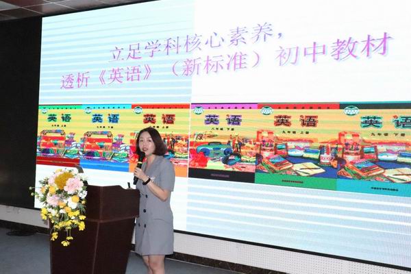 随后,廖老师为与会老师带来《立足学科核心素养透析《英语》(新标准)初中教材》主题讲座,分享了她对英语综合能力的理解。随后从教材结构出发,细致分析了课标与课本在语言技巧、阶段特点与侧重、模块结构等方面的联系,期间还结合问卷调查、歌曲、优秀课例等材料对课标与课本做了生动解读。最后,廖老师就新知呈现、语言操练与练习、starter以及Unit3的处理等方面分享了几点教材使用建议,干货满满。