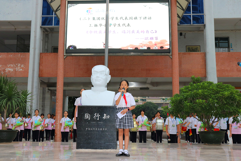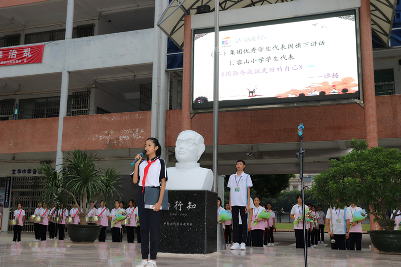 庄严的升旗仪式完毕后,育美教育集团容山小学的谭懿同学、育美教育集团振华小学的欧雅菲同学分别作了题为《用勤奋成就更好的自己》和《争做最美学生,遇到最美的自己》的演讲。育美教育集团文华中学夏仁斌主任作《为美好人生奠基》主题讲话。